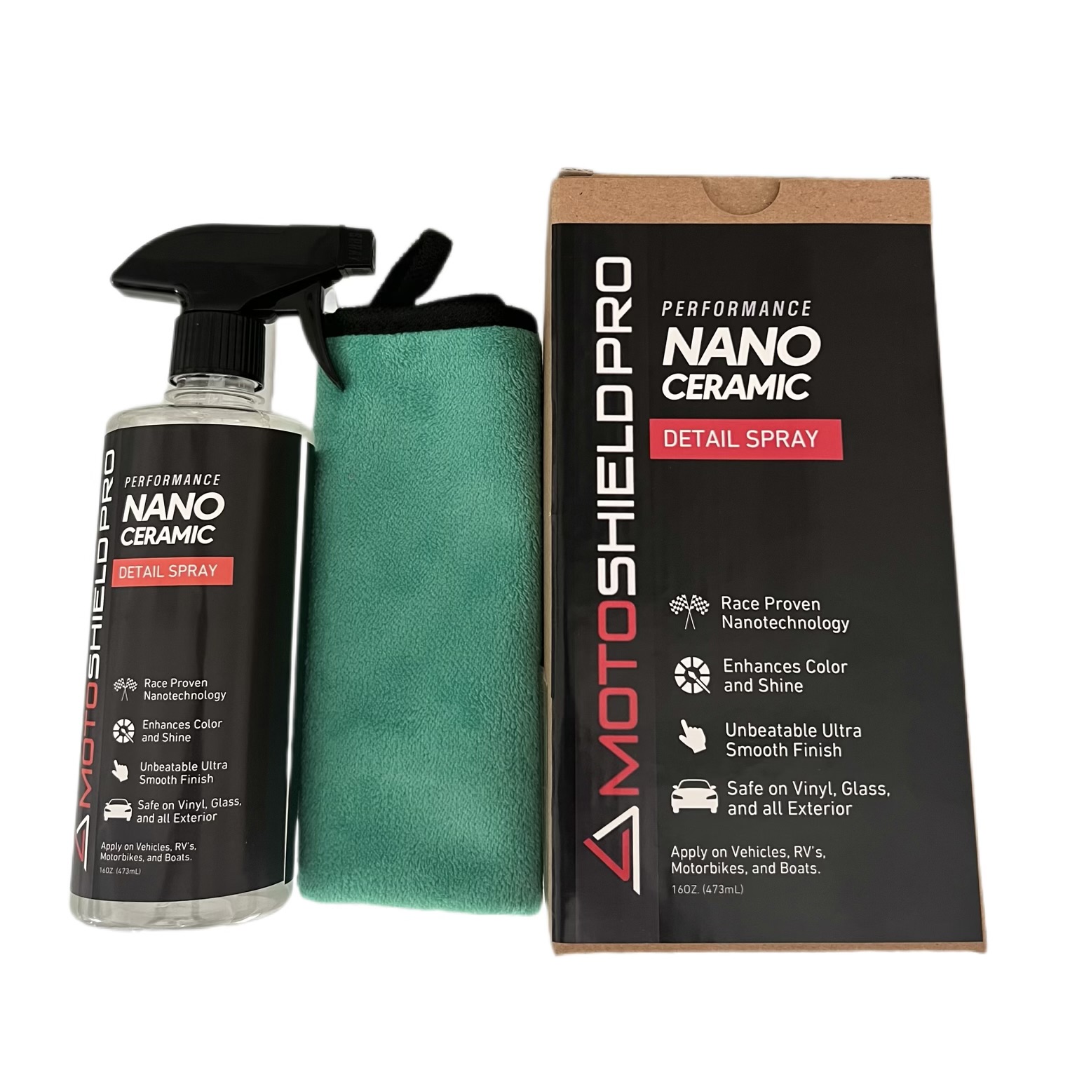 اسپری نانو سرامیک و محافظت کننده ی MOTOSHIELD PRO یک فرمول اختصاصی سرامیکی است که عمق و درخشش رنگ خودرو را افزایش داده و سطحی فوقالعاده لغزنده برای نگهداری آسان ایجاد میکند. این محصول باعث ایجاد سطح آب گریز و درخشش ماندگار تا ۶ ماه میشود. این محصول مناسب برای استفادهی روزمره و دیتیلرهای حرفهای است. از ویژگی های این محصول میتوان به موارد زیر اشاره کرد: پوشش مقرونبهصرفه برای ایجاد سطحی آبگریز، درخشش و براقیت بالا، مقاومت بالا، نگهداری و تمیزکاری آسان و همچنین استفاده ی آسان از محصول بدون نیاز به آموزش، مناسب برای تمام سطوح خارجی خودرو و تریم پلاستیکی، شیشه و رینگ.